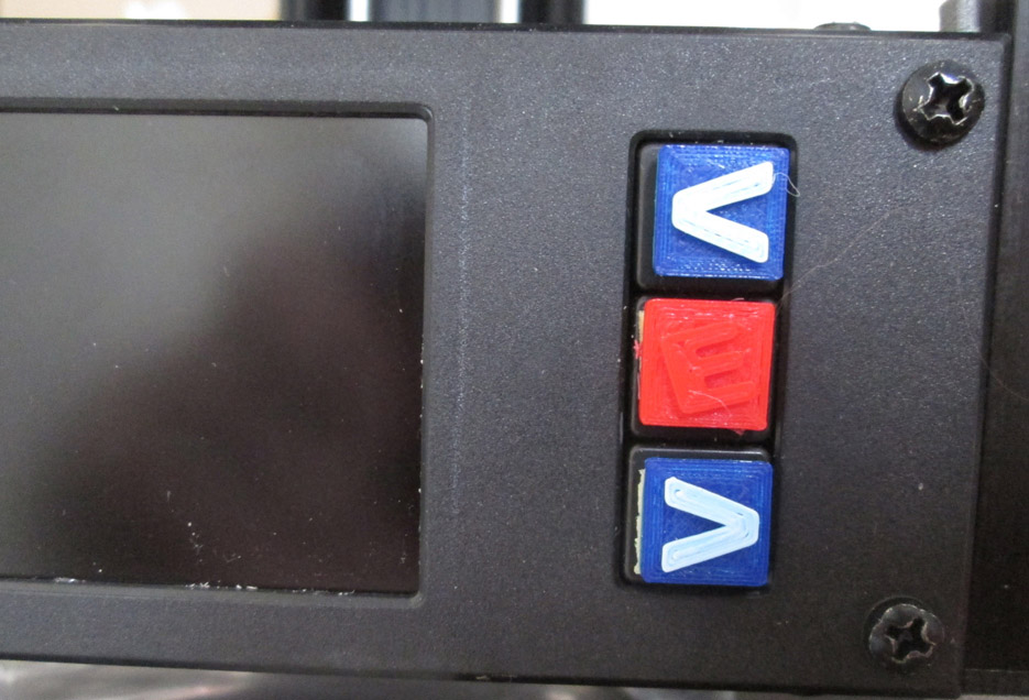 - Button Arrows - If there's one thing that should change on this printer it's the nearly invisible buttons for the display. The printer frame is black and so are these buttons. They are VERY hard to see if you don't have good lighting (or a flashlight). These buttons can be printed in whatever more visible filament you want and then stuck on to the buttons with double sided tape. I printed the middle button (Enter) in the red PolyLite. I printed the left/right buttons in the MatterHackers blue - except for the top raised part that I printed in white. I paused the print just as the raised part was starting and changed out the filament. This is a very manual and tricky thing to do but it's so satisfying to see it work.